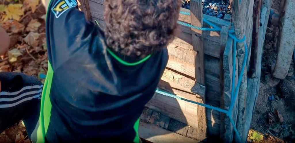Nos internamos en el Maule profundo y llegamos a un apartado sector, en el límite de las comunas de San Javier y Empedrado, conocido como: “La Quebrada”. Un punto en la mitad de la nada a donde se llega por un camino de tierra rodeado de plantaciones de pino. Casi no se ven casas en las cercanías y el lugar hace honor a su nombre porque acá la vida se desarrolla en torno a una quebrada, en cuyo bajo permanece oculto, en medio de las plantaciones forestales, un pequeño y añoso viñedo, que es el que motiva nuestra presencia en este rincón maulino. Aquí, nadie sabe desde cuándo; cada mes de abril se desarrolla está práctica ancestral conocida como Mingaco. Llegamos temprano pero los lugareños ya se encontraban en plena faena. Unos cortan los racimos con impresionante destreza y los acumulan en canastos. Una vez llenos, los “canasteros”, se encargan de transportar la uva negra hasta alguna de las cuatro carretas distribuidas estratégicamente en el predio. El día está completamente soleado pero una intensa brisa corre por la quebrada en todo momento. En el lugar contamos alrededor de 20 personas que se sorprenden con nuestra presencia ya que no es habitual ver a extraños por estos lugares y menos en estás faenas que permanecen lejos del ojo de turistas, autoridades y medios de comunicación. Aquí no se vive una recreación ni esta actividad forma parte de la celebración de una semana de algo. No está en ningún calendario municipal ni tiene propósitos promocionales. Lo que aquí se vive es 100% genuino y es la esencia de un Maule que nos conecta con nuestra propia historia. Yunteros y carretas pasan a ser ahora los protagonistas del Mingaco. Una vez enyuntados los bueyes son ubicados al frente de las respectivas carretas y se aprestan a subir la quebrada con sus respectivas cargas, tarea nada fácil, pero hombres y bueyes saben bien lo que hacen