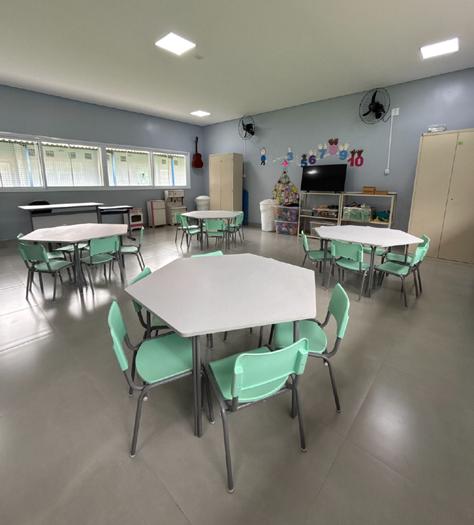 cozinha com armazenamento, refeitório integrado ao pátio, seis salas de aula, trocador, área de banho para bebês e espaço externo.