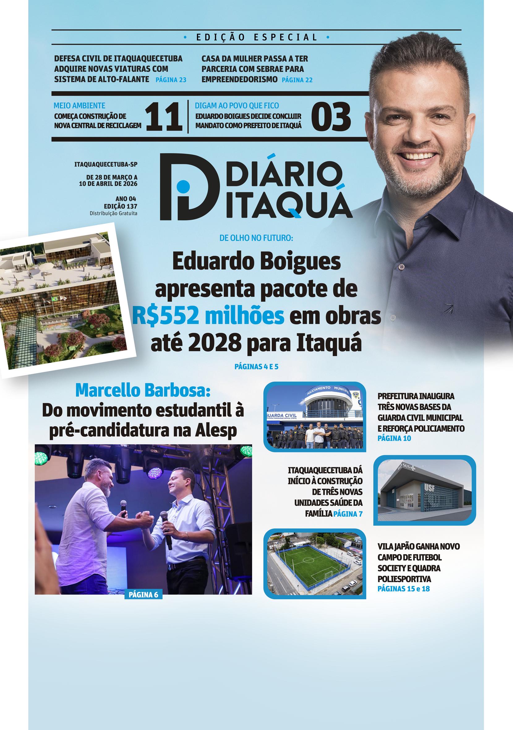O prefeito de Itaquaquecetuba, Eduardo Boigues, marcou a cena política do Alto Tietê e do Estado na noite de terça-feira (31 de março) com o anúncio de que não irá renunciar ao comando do Poder Executivo para disputar as eleições deste ano como candidato a deputado federal. A declaração foi feita durante a apresentação do pacote de obras “Itaquá Pra Frente”, que confirmou mais de R$552 milhões em investimentos para o município até o fim de 2028.