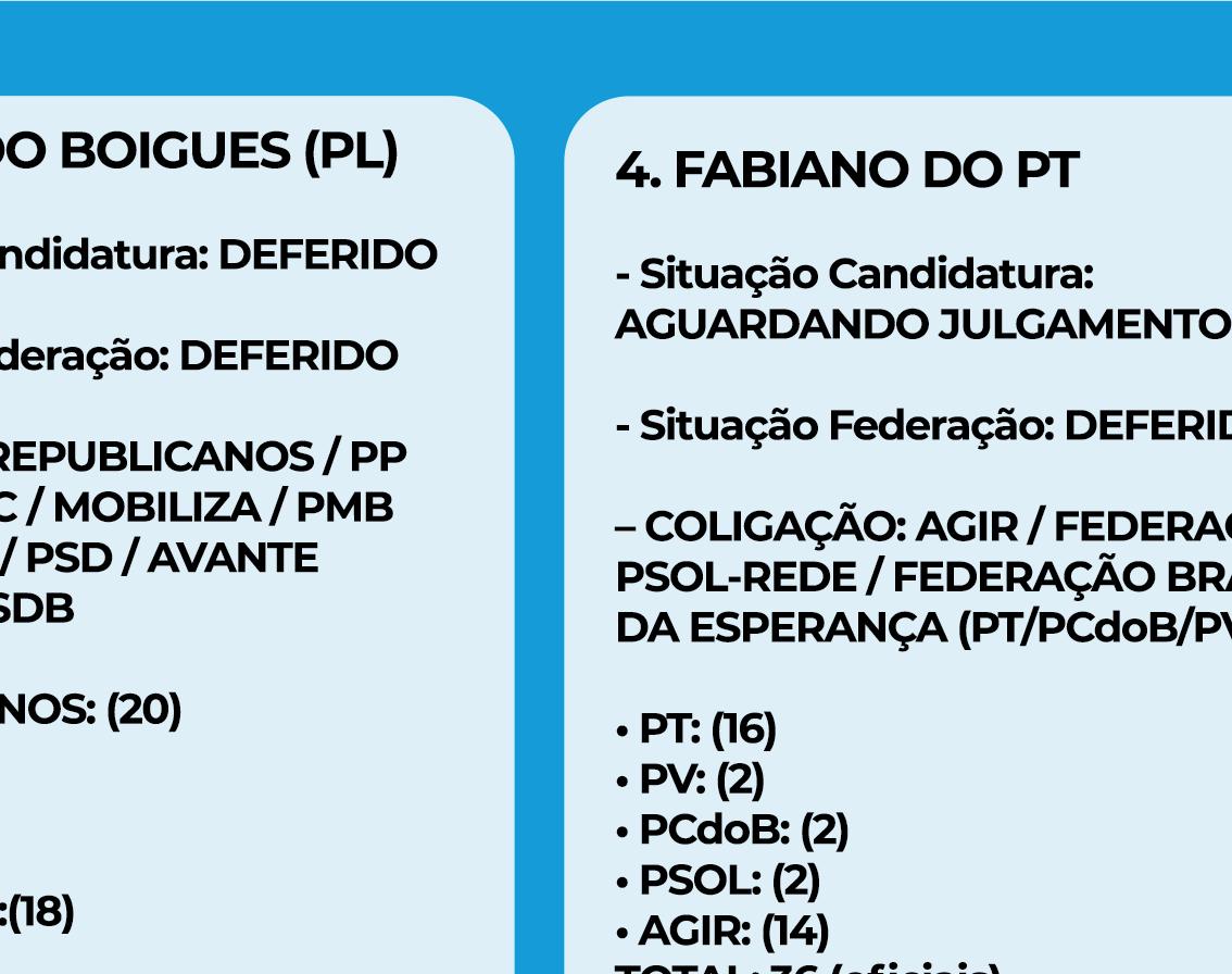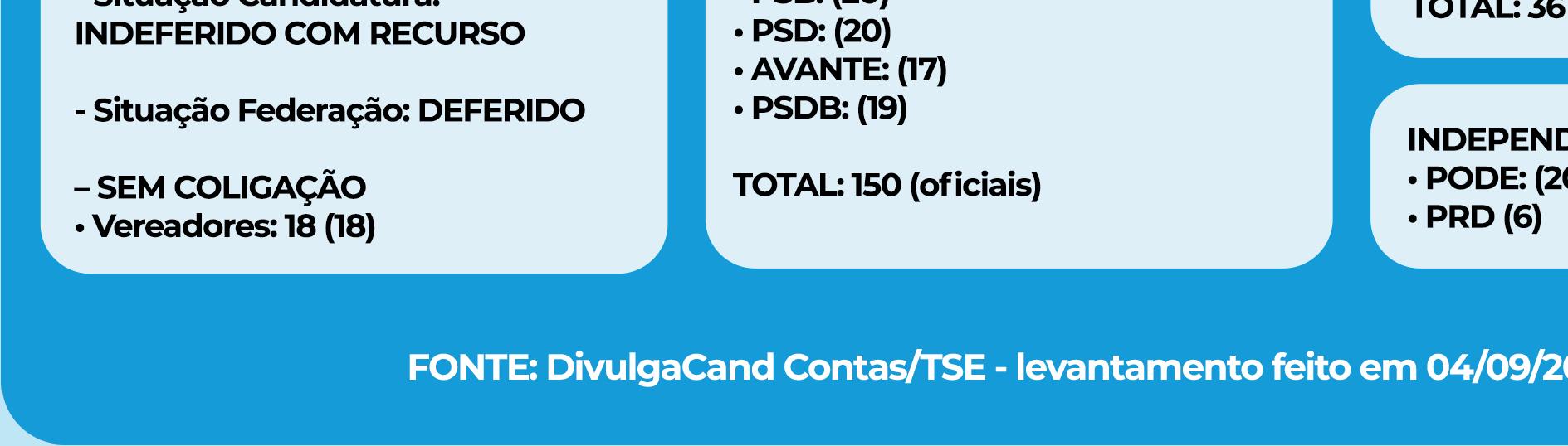 Segundo a plataforma “DivulgaCand”, do Tribunal Superior Eleitoral, a chapa majoritária com o maior número de concorrentes ao Poder Legislativo é o atual prefeito, Eduardo Boigues, com 150 postulantes oficiais à Câmara, de 9 das 13 legendas.
