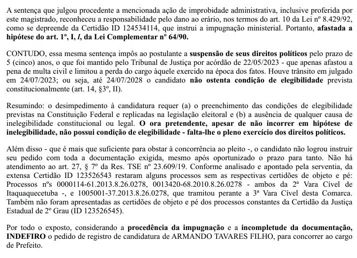 ELEIÇÕES 2024: JUSTIÇA ELEITORAL DERRUBA CANDIDATURA DE ARMANDO DA FARMÁCIA EM ITAQUÁ PÁGINA 3
