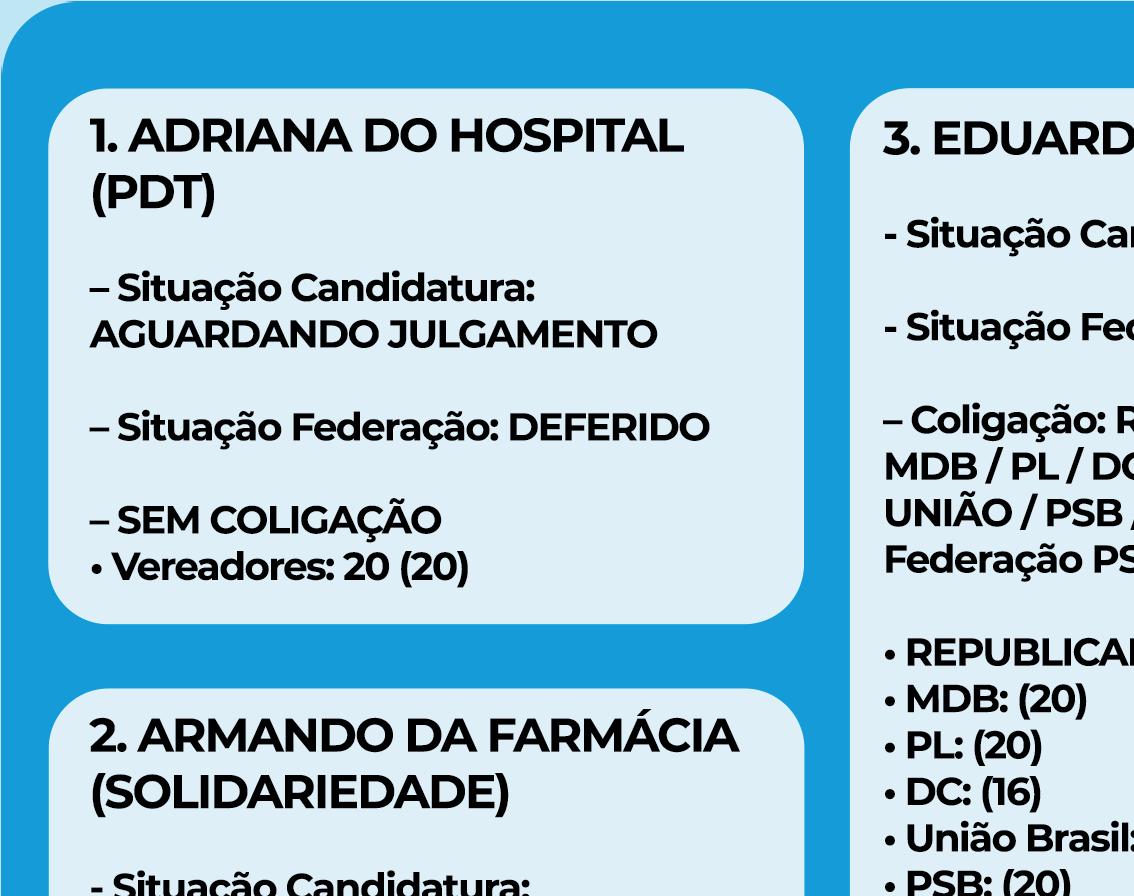 Adriana do Hospital, que concorre pelo PDT sem coligação, apresentou o número máximo por legenda para a cidade, com 20 candidatos a vereador. Armando da Farmácia, por sua vez, trouxe 18 concorrentes pelo Solidariedade à Casa de Leis pelo Solidariedade, também sem legendas associadas.