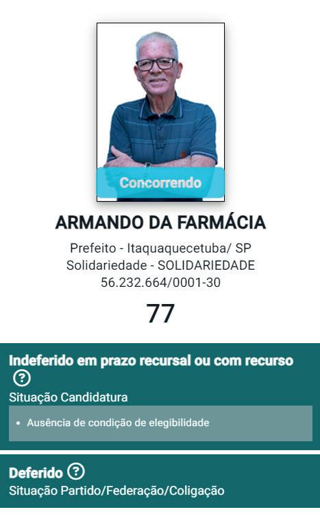 Em consulta ao portal “DivulgaCand Contas”, do Tribunal Superior Eleitoral (TSE), consta sua situação como “Indeferido em prazo recursal ou com recurso” - a mesma situa-