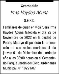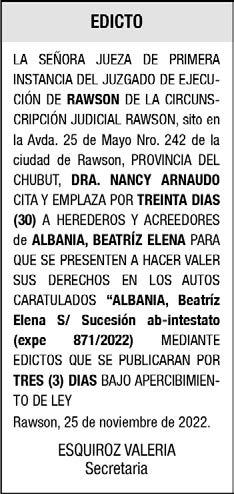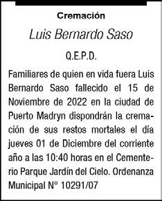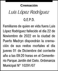 Ayer (30 -11-22) a las 05:30 horas fa lleció en Trelew, el sr. Adolfo Vázquez “El Indio” a la edad de 83 años. Su es posa, hijos, hijos politicos, nietos, bis nietos, y demas familiares participan su deceso. Sus restos recibirán sepul tura en el Cementerio Municipal de la ciudad de Trelew hoy 01-12-2022 a las 10:00 horas. Su desaparición enluta a las familias de: Vázquez, Pérez, Bala rio, Ferrari, Chipola, Quijano y otras. A pedido de la familia no se realiza rá velatorio.