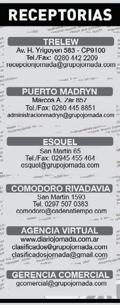 Domicilio legal: Yrigoyen 583 (9100) Trelew, provincia de Chubut. Tel./Fax: (0280) 442-2209 (líneas rotativas). recepcionjornada@grupojornada.com