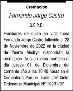 Ayer (30 -11-22) a las 07:15 horas fa lleció en Trelew, el sr. Pedro Antonio Miranda de la Torre a la edad de 94 años. Su esposa, hijos, hijos politicos, nietos, bisnietos, amigos y demas familiares participan su deceso. Sus restos recibirán sepultura en el ce menterio Parque Jardín del Cielo de la ciudad de Trelew, hoy 01-12-2022 a las 11:00 horas. Su desaparición enluta a las familias de: Miranda de la Torre, Price, Saiegg, Villalva, Navarro, Gallo, Barria, Mancilla, Barrientos, Oyarzo, Alvarado, Santillán, García Burloti,