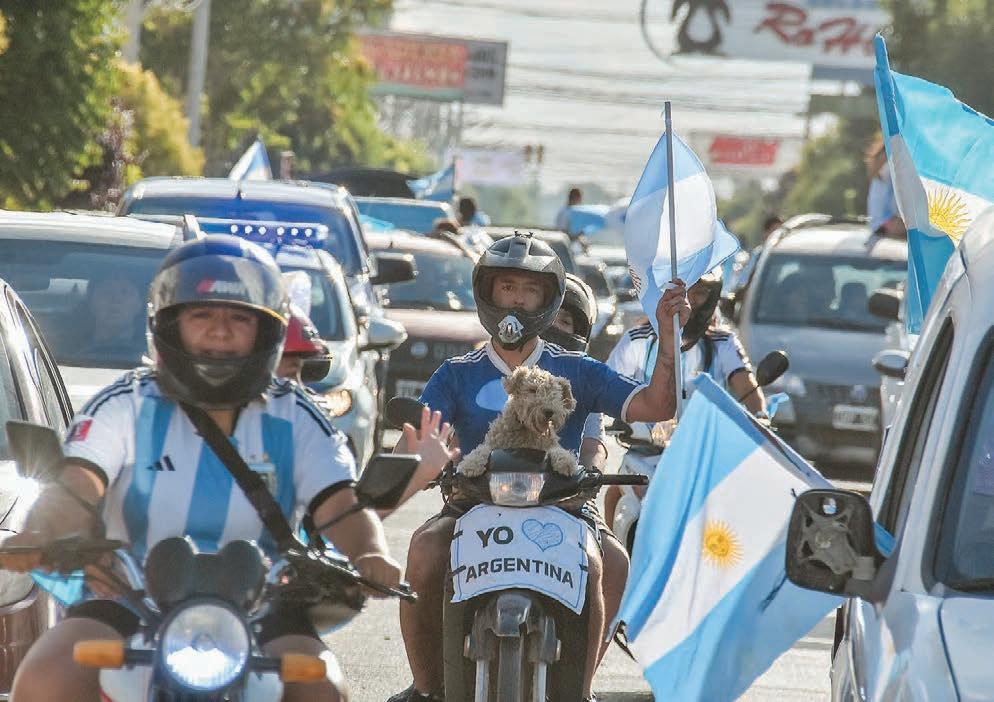 Festejo loco. Ni el perrito se quería perder los festejos por el pase de la Selección a cuartos de final. Las calles de Trelew fueron otra vez una locura.
