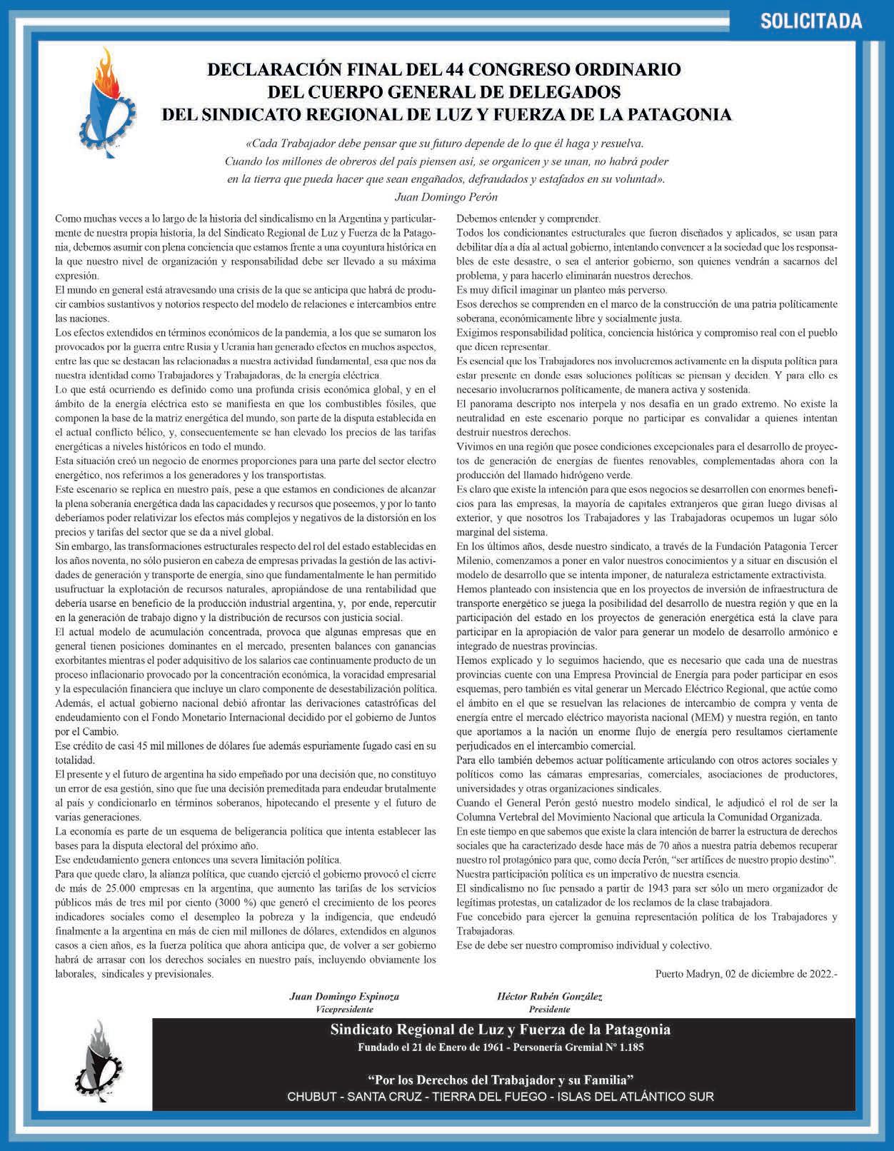 digno y la distribución de recursos con justicia social”, reza en uno de sus párrafos el documento final del Congreso de Luz y Fuerza de la Patagonia que concluyó el viernes en Puerto Madryn.