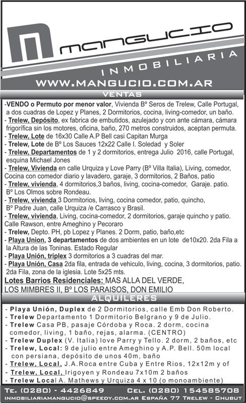 Vendo en Trelew depto 1 piso cocina comedor 3 domitorios baño lavadero sobre calle Alem Padre J. Muzio. Trelew 0280 154690831 (1204)
