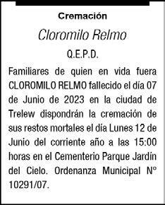 Ayer (08-06-2023) a las 00.45 horas falleció en la ciudad de Trelew, la sra. Mila Del Carmen Ascencio Obando a la edad de 70 años. Su esposo, hijos, hijos politicos, nietos, hermanos de la fe, amigos y demás familiares participan de su deceso. Sus restos recibieron sepultura en el cementerio parque Jardín del Cielo de la ciudad de Trelew ayer (08-06-23) a las 16.00 horas. Su sentida desaparición enluta a las familias Ascencio, Obando, Collio, Oporto, Mardones, Koser y otras.