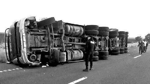Personal policial tuvo que interrumpir la circulación en el tramo Puerto Madryn–Trelew, dado que el camión obstruyó el tráfico al quedar atravesado en un carril.# El camión se dirigía a Trelew cuando despistó en la ruta y se tumbó.