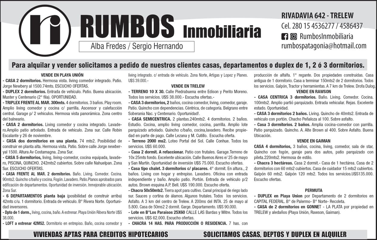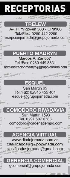Se ofrece albañil prolijo y responsable realizo todo tipo en construcción plateas techos mamposterías colocación de aberturas cerámicas ampliaciones térmicas. Trelew. Cel. 0280 15302209. (1207) Se realizan trabajos metalúrgicos portones corredizos automáticos frente de rejas tinglados techos muebles. Trelew. Cel. 0280 154382470. (1207)
