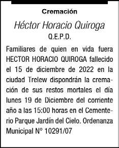 Anteayer (15 -12-22) a las 12.55 horas falleció en Trelew, el sr. Hector Horacio Quiroga a la edad de 69 años. Sus hijos, hijos politicos, nieto, hermana, amigos y demas familiares participan su deceso. Sus restos recibieron sepultura en el Cementerio Parque Jardin del Cielo de la ciudad de Trelew ayer ( 16-12-2022 ) a las 11:00 horas. Su desaparición enluta a las familias de: Quiroga, Castro, Hompanera y otras.