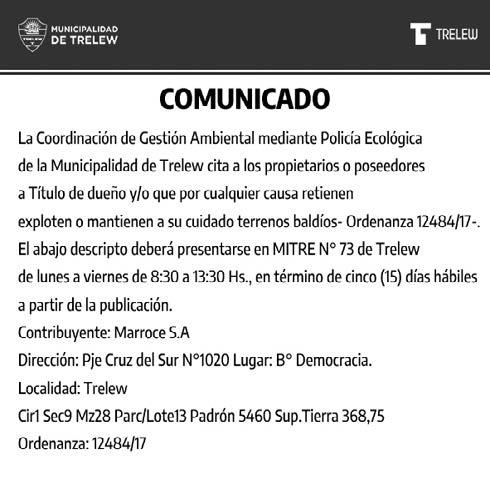En la Comisaría de la Mujer de Trelew, ubicada en el Pasaje San Juan 345 de esa ciudad, se solicita el urgente comparendo de los ciudadanos Angel Gabriel Pino, Mario Norberto Antenado y Florencia Chapingo. En