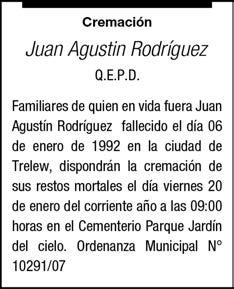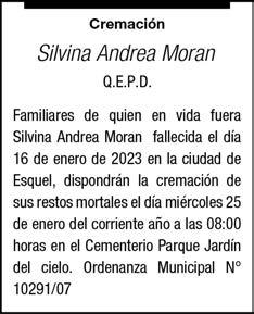El día 17-01-23 a las 10:25 horas falleció en Rawson a la edad de 71 años. Su esposa, hijos, hijas políticos, nietos, hermanos, cuñados, sobrinos, amigos y demás familiares participan de su deceso. Sus restos recibieron sepultura en el Cementerio Parque Jardín del Cielo de la Ciudad de Trelew el día (18-01-23) a las 11.00 horas. Su sentida desaparición enluta a las familias de Montesino, Lauquen, Martín, Echegaray, Figueroa, Chingoleo, Calvo, Martín Zárate y otras.