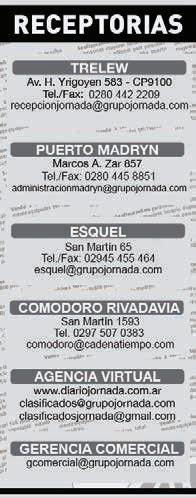 Domicilio legal: Yrigoyen 583 (9100) Trelew, provincia de Chubut. Tel./Fax: (0280) 442-2209 (líneas rotativas). recepcionjornada@grupojornada.com