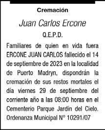 Ayer (27-09-2023) a las 14.50 horas falleció en la ciudad de Trelew, el sr. Alberto Guzman a la edad de 56 años. Sus hijos, compañera, hijos politicos, madre, hermanos, sobrinos, primos, amigos y demas familiares participan de su deceso. Sus restos recibirán sepultura en el Cementerio Municipal de la ciudad de Trelew hoy (28-09-23) a las 11.00 horas. Su sentida desaparición enluta a las familias de: Guzman, Mella, Arias, y otras. Sala velatoria: 28 de Julio 1360 - sala “C” de Trelew a partir de las 09:00 horas del día de la fecha (28-09-23).