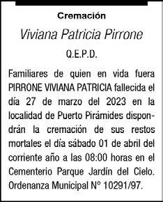 El día (29-03-23) a las 22:30 falleció en Trelew, la sra. Sandra Mariela Navarro a la edad de 54 años. Sus hijos, hijos politicos, nietos, hermanos, cuñados, sobrinos y demás familiares participan de su deceso. Sus restos recibieron sepultura en el cementerio municipal de Trelew ayer (30/03/23) a las 16:00 horas. Su sentida desaparición enluta a las familias de: Navarro, Cayo, Jarpa, Ojeda, Arroyo, Aska y otras.