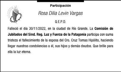 El día (30 -11-22) a las 16.50 horas falleció en Trelew Betie Noemí Evans a la edad de 73 años. Hijos, hijos polí ticos, nietos, hermanos, cuñados, so brinos y demás familiares participan su deceso. Sus restos recibieron sepul tura en el Cementerio Municipal de la Ciudad de Trelew el día, 01-12-2022 a las 16:00 horas. Su desaparición enlu ta a las familias de Evans, Sese, Pizza, Falcón.