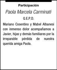 El día 04-06-2023 a las 13.45 horas falleció en la ciudad de Trelew. La sra. Paola Marcela Carminati a la edad de 51 años. Su esposo, hijos, hermanos, cuñados, sobrinos, madre política, amigos y demás familiares participan su deceso. Sus restos recibieron sepultura en el cementerio Parque Jardín del Cielo de la ciudad de Trelew (05-06-23) a las 10.00 horas. Su sentida desaparición enluta a las familias de Carminati, Diez, Rossi, Ortiz, Lorenzo, Elliot, Jaureguizar y otras.