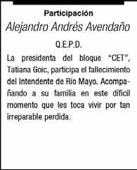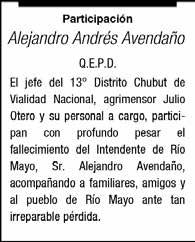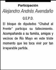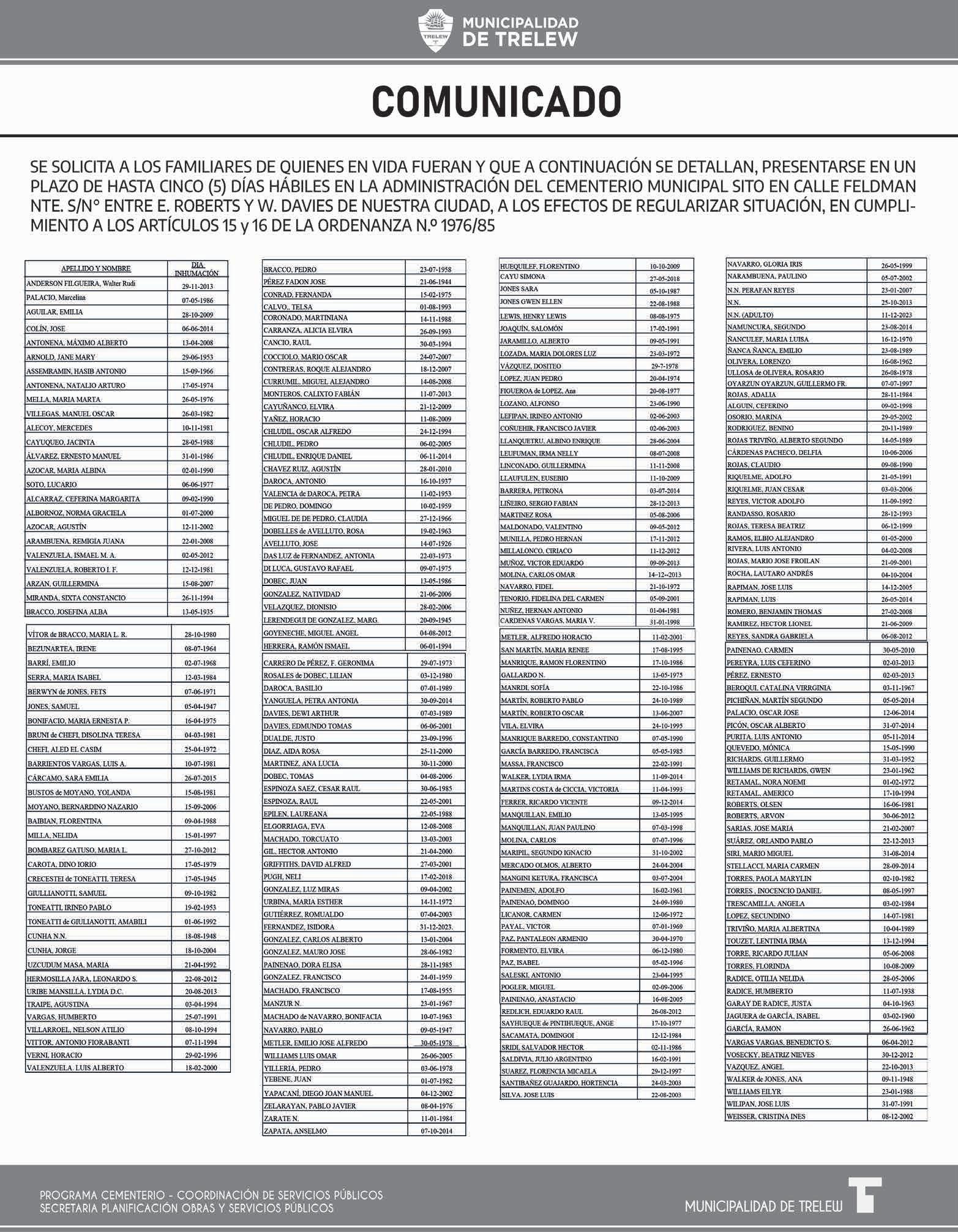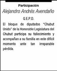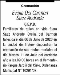El día (06-07-23) a las 18:30 horas falleció en Trelew. El sr. Gabriel Dos Santos Pereira a la edad de 49 años. Su esposa, hijos, hermanas, sobrinos y demás familiares participan de su deceso. Sus restos recibieron sepultura en el cementerio parque Jardín del Cielo de la ciudad de Trelew (07/07/23) a las 10,00 horas. Su desaparición enluta a las familias de Dos Santos Pereira, Santos, Calvo, Morales Cabezas, Carrizo, Kolalski, Ramírez, Bejares, Morris, López y otras.