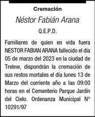Ayer (10-03-23) a las 09:45 horas falleció en Trelew. El sr Ignacio Recaredo Uribe Uribe a la edad de 83 años. Su esposa, hijos, hijas políticas, nietos, bisnietos y demás familiares participan de su deceso. Sus restos recibirán sepultura en el cementerio parque Jardín del Cielo de la ciudad de Trelew hoy (11/03/23) a las 10.00 horas. Su sentida desaparición enluta a las familias de Uribe, Ampuero, Garrido, Hernández, Huentilican y otras.
