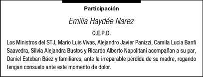 El Señor Gobernador, Esc. Mariano Arcioni, participa con profundo pesar el fallecimiento de la señora Emilia Haydée Narez, madre del señor Ministro del Superior Tribunal de Justicia, Dr. Daniel Esteban Báez. Acompañando a su familia y amigos ante esta irreparable pérdida, elevando una plegaria por su eterno descanso.