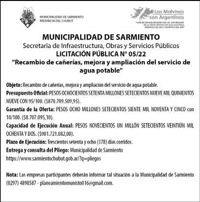 Manifestó que es “una licitación muy compleja, muy grande para el equipamiento de nuestro querido Hospital de Trelew como también las obras del Materno Infantil que se es tán llevando a cabo”. En ese sentido, agregó que “este Gobierno las puso en marcha en un momento muy difícil y hoy son realidades, es una satisfac ción muy grande poder dar esta res puesta a la ciudad de Trelew”.