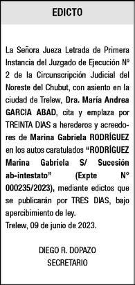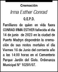 El día (14-06-23) a las 18:00 horas falleció en la ciudad de Trelew. La sra. Yolanda Monsalve a los 86 años de edad. Sus hijos, hijos políticos, nietos, bisnietos, sobrinos y de mas familiares participan de su deceso. Sus restos recibirán sepultura en el cementerio municipal de Trelew hoy (15-06-23) a las 11:30 horas. Su desaparición enluta a las familias de Monsalve, Sanz, Ferreira, Valiente y otras