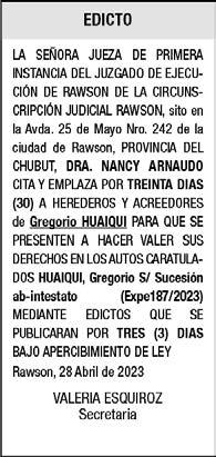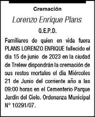 El día (14-06-23) a las 17:00 horas falleció en la ciudad de Trelew. El sr Jesús Arza a los 74 años de edad. Sus hermanos, sobrinos y de mas familiares participan de su deceso. Sus restos recibieron sepultura en el cementerio municipal de Trelew ayer (15-06-23) a las 15:00 horas. Su desaparición enluta a las familias de Arza, Miles, Roldán, Avallay, Calfunao y otras
