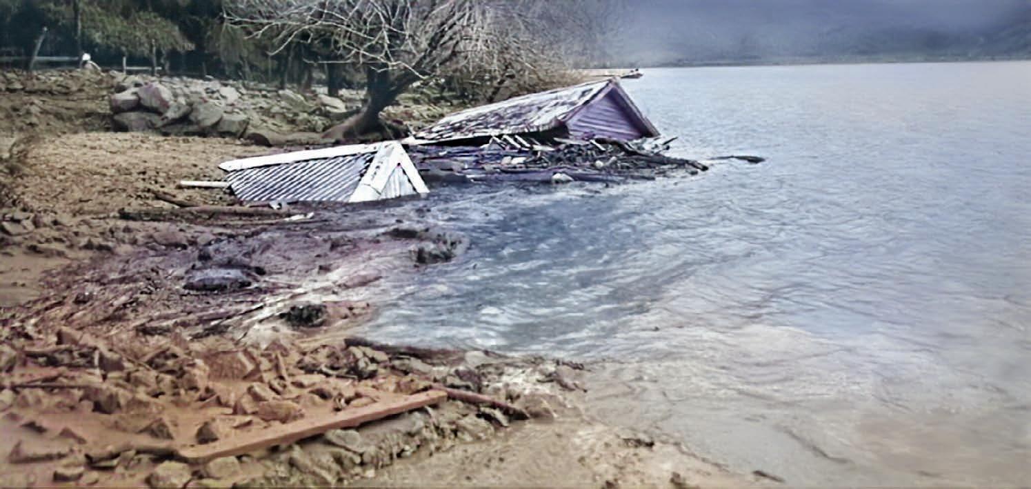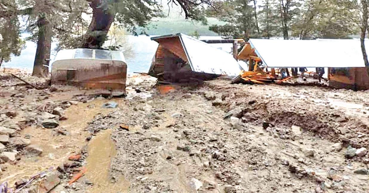 ● Un temporal desbordó un arroyo de montaña y el alud destruyó dormis, cabañas, una proveeduría y varios baños. Todo fue arrastrado dentro del Lago Epuyén. P. 21