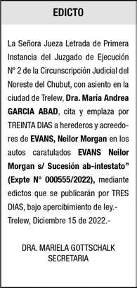 El día (15-02-23) a las 09.55 horas falleció en Trelew. El sr. Emiliano Ernesto Rius a la edad de 79 años. Su esposa, hijos, hijos políticos y demás familiares participan de su deceso. Sus restos recibieron sepultura en el cementerio municipal de la ciudad de Trelew (16/02/23) a las 11.00 horas. Su sentida desaparición enluta a las familias de Rius, Blaiotta, Ponce, Irigoin y otras.