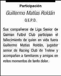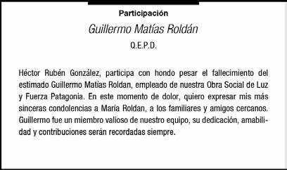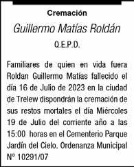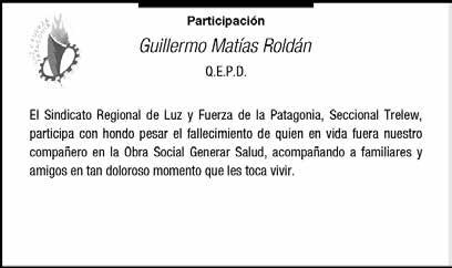 El día 16/07/23 a las 17,50 horas falleció en Trelew. El sr. Gillermo Matias Roldán a la edad de 41 años. Sus hermanas, sobrino, cuñados, tíos, primos, amigos y demás familiares participan de su deceso. Sus restos recibieron sepultura en el cementerio parque Jar-
