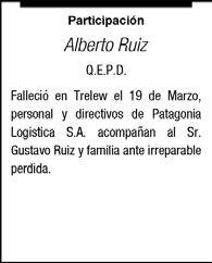 Alberto Ruiz (Q.E.P.D.)El día (19-03-23) a las 07:40 horas falleció en Trelew. El Sr. Alberto Ruiz a la edad de 71 años. Su esposa, hijos, hijos políticos, nieto, hermanos, cuñados, sobrinos y demás familiares participan de su deceso. Sus restos recibieron sepultura en el Cementerio Municipal de la ciudad de Trelew, ayer (20/03/23) a las 10.00 horas. su sentida desaparición enluta a las familias de Ruiz, Oyarzo, Jara, Garcia, Antelaf, Castillo, Calfulef, Troncoso, Melipil, Calderón y otras.