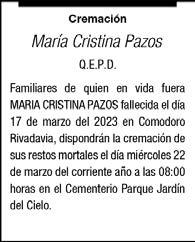 El Día (19-03-23) a las 23.45 horas falleció en Trelew. La Sra. María Angélica Remolcoy Cárcamo a la edad de 66 años. Sus hijos, hijos políticos, nietos, bisnietos, hermanos, cuñados, sobrinos y demás familiares participan de su deceso. Sus restos recibieron Sepultura en el Cementerio Parque Jardín del Cielo de la ciudad de Trelew ayer (20/03/23) a las 15.00 horas. Su sentida desaparición enluta a las familias de: Remolcoy, Soto, Bustamante, González y otras.