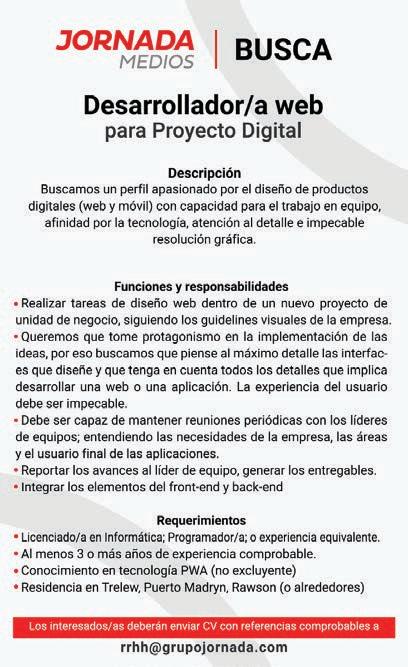 Publicidad: Departamento Comercial Yrigoyen 583 Tel.: (0280) 442-2209. e-mail: gcomercial@grupojornada.com