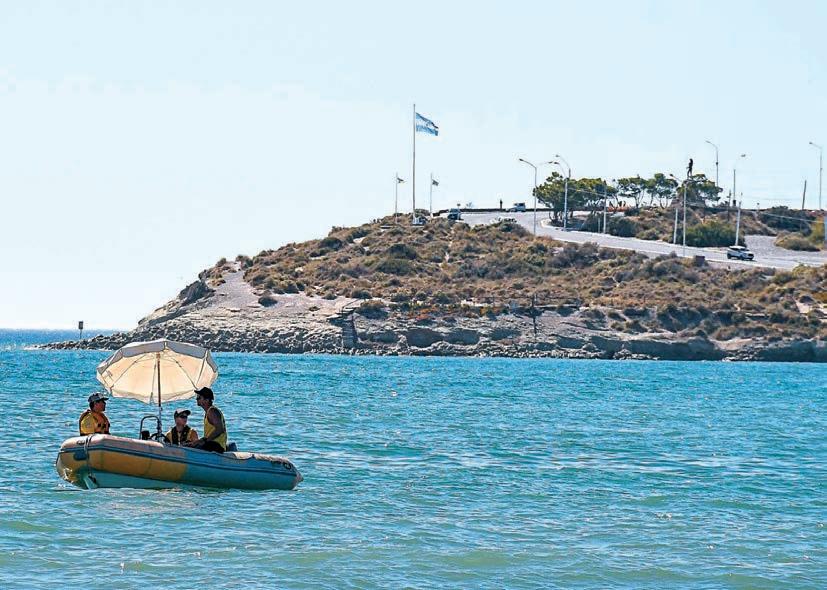 Ante el sol abrazador de ayer en Madryn, un grupo de personas navegó en un gomón con sombrilla incluida.