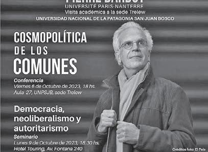 Dardot dará el viernes 6 desde las 18 una conferencia titulada “Cosmopolítica de los comunes”. Será en el Aula 27 de la UNPSJB. Mientras que el lunes 9 liderará el seminario “Democracia, neoliberalismo y autoritarismo”, desde las 18:30 en el Hotel Touring. Para tener en cuenta.#