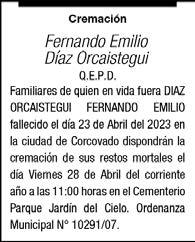 Sus hijos, hijos políticos, nietos, hermanos, sobrinos, amigos y demás familiares participan de su deceso. Sus restos recibieron sepultura en el cementerio parque jardín del cielo de la ciudad de Trelew ayer (26/04/23) a las 10:00 horas. Su sentida desaparición enluta a las familias de: Fernández, Alvarado, Cayul, y otras