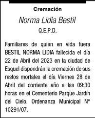 Sus hijos, hijos políticos, nietos, hermanos, sobrinos, amigos y demás familiares participan de su deceso. Sus restos recibieron sepultura en el cementerio parque jardín del cielo de la ciudad de Trelew ayer (26/04/23) a las 10:00 horas. Su sentida desaparición enluta a las familias de: Fernández, Alvarado, Cayul, y otras