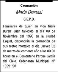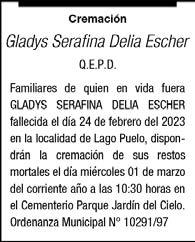 Ayer (27-02-23) falleció en la ciudad de trelew. La sra. María Albanesi a la edad de 87 años. Sus hijos, hijas políticas, nietos, amigos y demás familiares participan de su deceso. sus restos recibieron sepultura en el cementerio parque jardín del cielo de la ciudad de trelew ayer (27/02/23) a las 17.30 horas. su sentida desaparición enluta a las familias de Albanesi, Betti, Littletait. Saabedra, Singler, Solis, Agüero y otras.