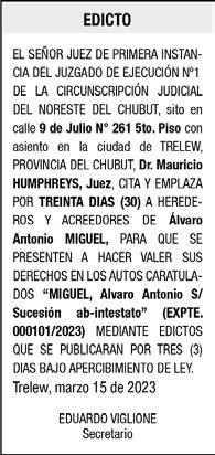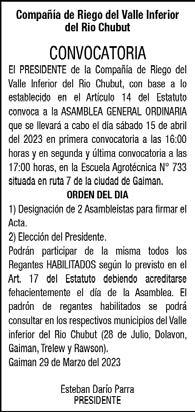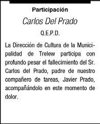 Ayer (27-03-23) a las 08,30 horas falleció en Trelew. La sra. Mónica Graciela Pío a la edad de 68 años. Su esposo, hijos, hijos políticos, nietos, madre y demás familiares participan de su deceso. Sus restos recibieron sepultura en el cementerio municipal de la ciudad de Trelew ayer (28/03/23) a las 10:00 horas. Su sentida desaparición enluta a las familias de Pío, Arriegada, Rosales, Gómez, Huenelaf y otras.