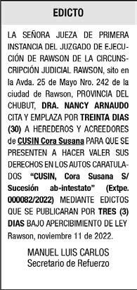 El día (27-03-23) a las 21,35 horas falleció en Rawson la sra. María Azucena Palma a la edad de 90 años. Sus hijos, hijos políticos, nietos, bisnietos participan de su deceso. Sus restos recibieron sepultura en el cementerio parque Jardín del Cielo de la ciudad de Trelew ayer (28/03/23) a las 11:00 horas. Su sentida desaparición enluta a las familias de Palma, Pérez, Otero, Castillo, Ramón, Torne, de la Moral y otras.