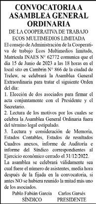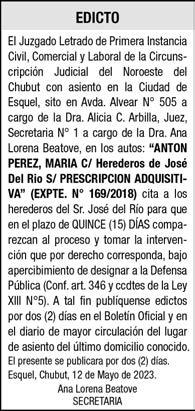 El día (29-05-23) a las 07.50 horas falleció en Trelew. El sr. Aniceto Sandoval a la edad de 74 años. Sus hijos, hijos políticos, nieta, bisnietos, hermana, cuñado, sobrinos, primos, tíos, amigos y demás familiares participan de su deceso. Sus restos recibirán sepultura en el cementerio municipal de la ciudad de Trelew hoy (30-05-23) a las 10.00 horas. Su sentida desaparición enluta a las familias de Sandoval, Curilaf, Lemos, Toledo, Arriagada, Caravajal, Painequeo, Gil, Altamirano, Delgado, Pintihueque, Aquino, Pérez, Trejo y otras.