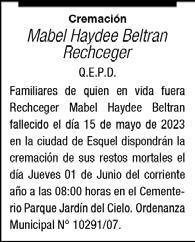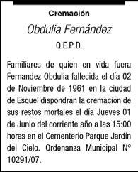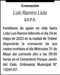 de 62 años. Su esposa, sus hijos, hijos políticos, nietos, hermanos, sobrinos, cuñados, amigos y demás familiares participan de su deceso. Sus restos recibieron sepultura en el cementerio parque Jardín del Cielo de la ciudad de Trelew ayer (29-05-23). Su sentida desaparición enluta a las familias de Ferro, Iralde, Novo, y otras.
