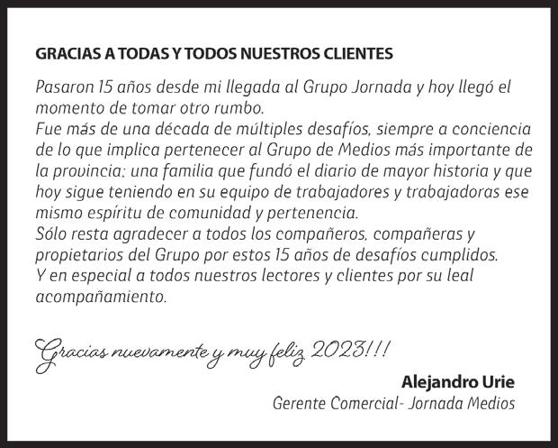 Publicidad: Departamento Comercial Yrigoyen 583 Tel.: (0280) 442-2209. e-mail: gcomercial@grupojornada.com