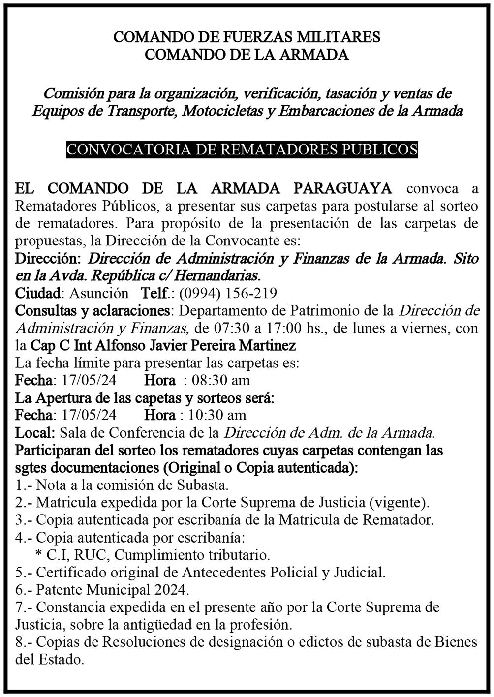 ASAMBLEA GENERAL ORDINARIA. De acuerdo con lo establecido en el Estatuto Social, conforme al Art. Nº 1081 del Código Civil. El Directorio de ANY AUTOPARTS S.A., convoca a Asamblea General Ordinaria para el día 21 de mayo del 2024, a las 10:30 horas en el local de la firma, sito Av. San Blas Km 8 ½, Ciudad del Este, Alto Paraná, con el objeto de considerar el siguiente orden del día: 1- Designación de un presidente y secretario de asamblea. 2- Lectura y Consideración de la Memoria del Directorio, Balance General, Cuadro de Resultado de Ganancias y Pérdidas e Informe del Síndico correspondiente al ejercicio fiscal 2023. 3- Elección de los miembros del Directorio y Síndico 4- Fijación de Remuneraciones de Directores y Síndicos. 5- Destino de las Utilidades 6- Temas varios 7- Designación de dos accionistas para firmar el acta de asamblea. NOTA: Se recuerda a los Accionistas los requisitos especiales exigidos por los Estatutos Sociales para su participación. EL DIRECTORIO. 69575/11/05-