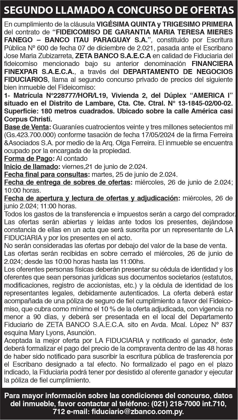 Accionistas a llevarse a cabo el día 28 de junio de 2024, a las ocho horas, en primera convocatoria y una hora después, en segunda convocatoria en caso de no reunir el quórum legal para la realización de la primera, en su sede social situada en la Avda. Félix Bogado casi Ana Diaz, Oficina 701/702 de la ciudad de Asunción, para tratar el siguiente orden del día: 1-Consideración de la memoria anual del directorio, balance general, cuadro demostrativo de pérdidas y ganancias e informe del síndico, correspondiente al ejercicio cerrado al 31 de diciembre de 2023. 2-Tratamiento de los resultados del ejercicio y/o de ejercicios anteriores y/o de las reservas facultativas 3- Emisión de acciones dentro del capital social autorizado. 4-Designación de un nuevo Directorio, la distribución de sus cargos, la asignación de sus remuneraciones. 5-Designación de un Sindico Titular y su remuneración. 6-Designación de Accionistas para rubricar el Acta de Asamblea. Obs.: Se recuerda a los Accionistas lo estipulado en el Art. 21 del Estatuto Social referente a la obligatoriedad de depositar en la sociedad dentro del plazo establecido sus Acciones o Certificados Bancarios de depósitos de las mismas para tener derecho de participar en la Asamblea. Asunción, 17 de junio de 2024. 71625/23/06-