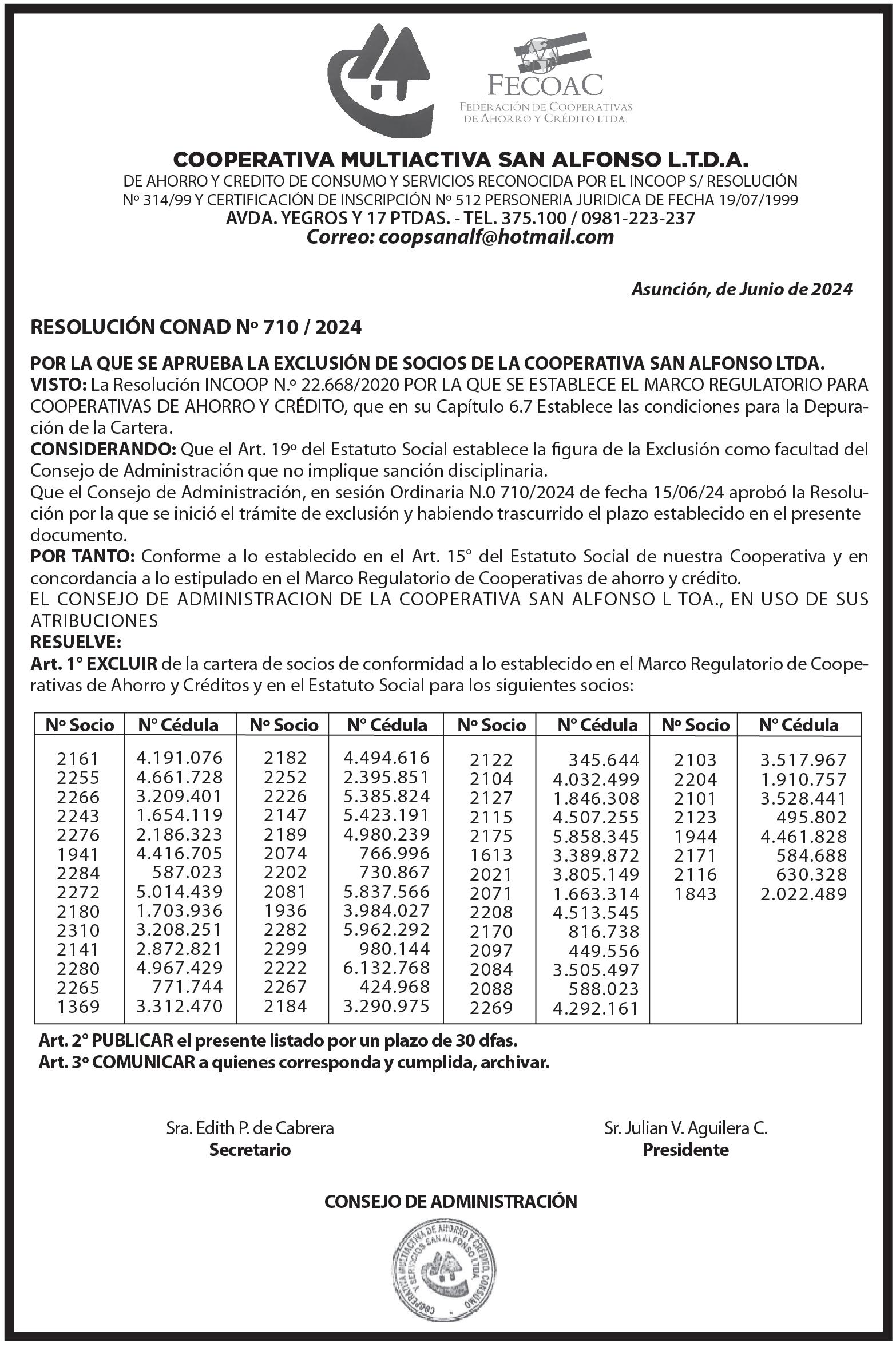CONVOCATORIA ASAMBLEA GENERAL EXTRAORDINARIA. De acuerdo a lo establecido en los Artículos 31, 32, 34, 35, 36, 37, 38 y 39, del Estatuto Social y el Art. 1080 del Código Civil, el Directorio de “Aseguradora Tajy Propiedad Cooperativa S.A. de Seguros” convoca a las Accionistas a la ASAMBLEA GENERAL EXTRAORDINARIA, a realizarse desde la Casa Matriz de la Aseguradora Tajy Propiedad Cooperativa S.A de Seguros, sito en la Avda. Rca. Argentina esq. Ing. Albino Mernes de la ciudad de Asunción –Paraguay; a través de medios Telemáticos, con la plataforma virtual ZOOM, el día 28 de junio del 2024 a las 10:00 horas, en Primera Convocatoria. Si a la hora señalada no se reuniese el quórum legal previsto en el Estatuto Social, se reunirá en su Segunda Convocatoria una hora después de la Primera, para considerar el siguiente: ORDEN DEL DÍA: 1-Rescate de las Acciones Preferidas de la Accionista Oikocredit, Ecumenical Development Cooperative Society U.A. 2-Designación de dos (2) Representantes de Accionistas para suscribir el Acta de Asamblea, conjuntamente con el Presidente y Secretario. Se recuerda a los Señores Accionistas lo dispuesto en el Art. 36 del Estatuto Social, donde se establece que para asistir a la Asamblea de Accionistas deben depositar en la Administración de la Sociedad sus acciones o certificados bancarios de depósito librado al efecto, con no menos de 3 (tres) días hábiles de anticipación de la fecha fijada. Así también se solicita la comunicación del nombre completo y número de Cédula de vuestros representantes designados, con la misma anticipación para su registro en el Libro de Asistencia a Asambleas. Ing. Gustavo Samaniego, Presidente. 71533/22/06-