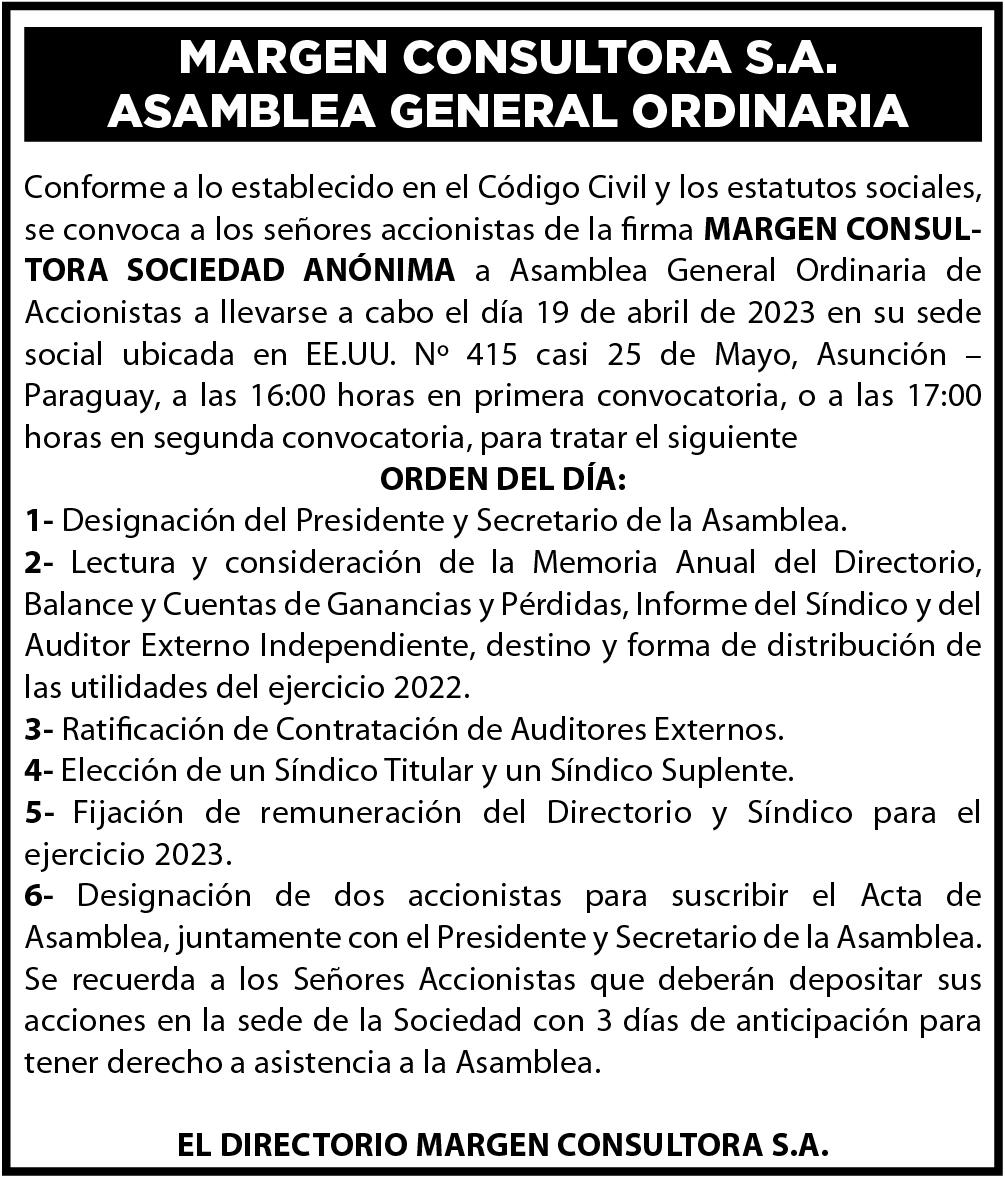 S.A. convoca a Asamblea General Ordinaria de Accionistas, para El día 15 de abril de 2023 en el local social de la firma ubicada sobre la calle Mcal. López e/1º de Diciembre de la ciudad de Pedro Juan Caballero, a las 8:00 horas en primera convocatoria y 9:00 horas en segunda convocatoria, para tratar los siguientes puntos del Orden del día: 1Elección del Presidente y Secretario de la Asamblea. 2- Lectura y consideración del Balance General, Estado de Resultados, Memoria del Directorio, Informe del Síndico y Anexos del ejercicio cerrado al 31 de diciembre de 2022 3Tratamiento para la distribución de utilidades. 4- Designación de Directores y Síndicos. 5- Retribución de Directores y Síndicos. 6- Designación de un accio-